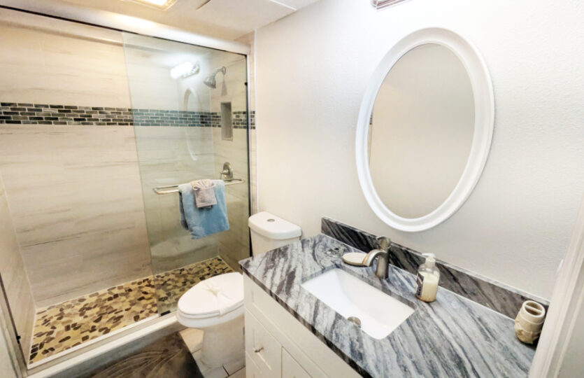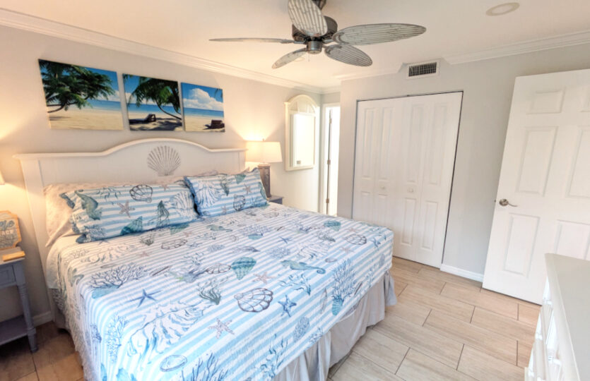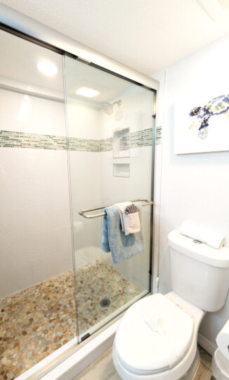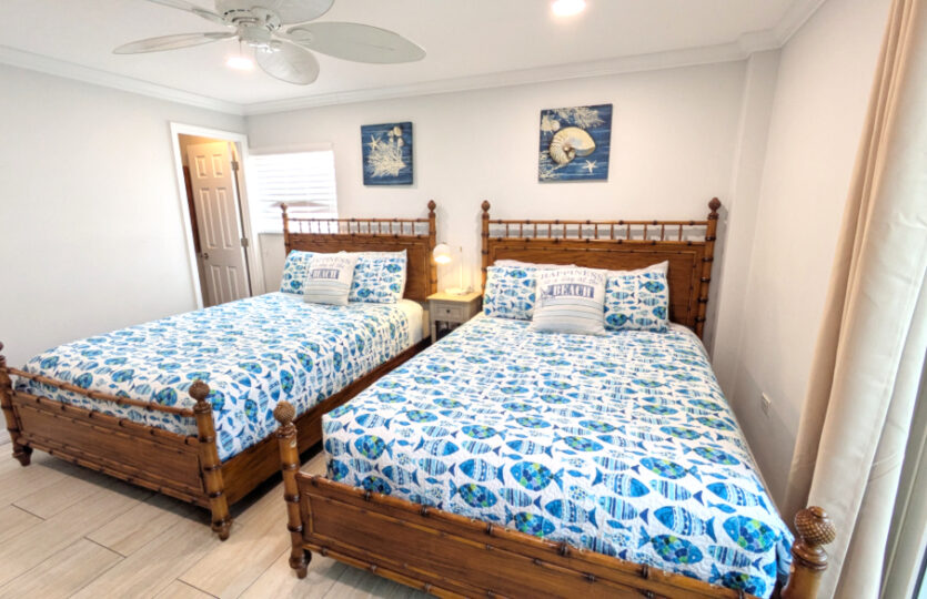 There are two suites with private baths. The condo sleeps 6 comfortably with a queen bed it the first bedroom and two queen beds in the second bedroom. Both bathrooms are completely renovated with brand-new walk-in showers, new vanity, toilet and lighting. With a split floor plan, each suite is on opposite sides of the condo, providing privacy for both suites. Both bedrooms have new slider doors that open to the screened lanai offering beautiful Gulf views.