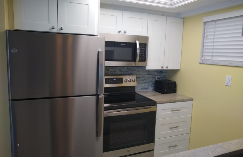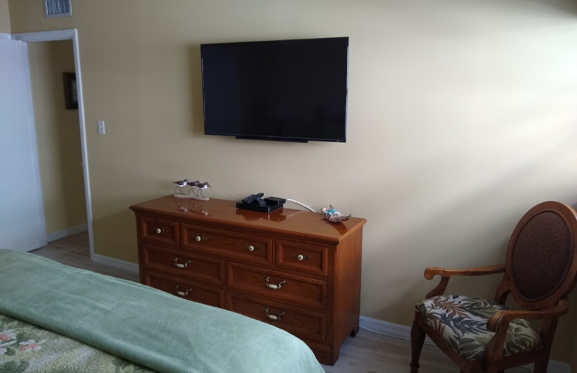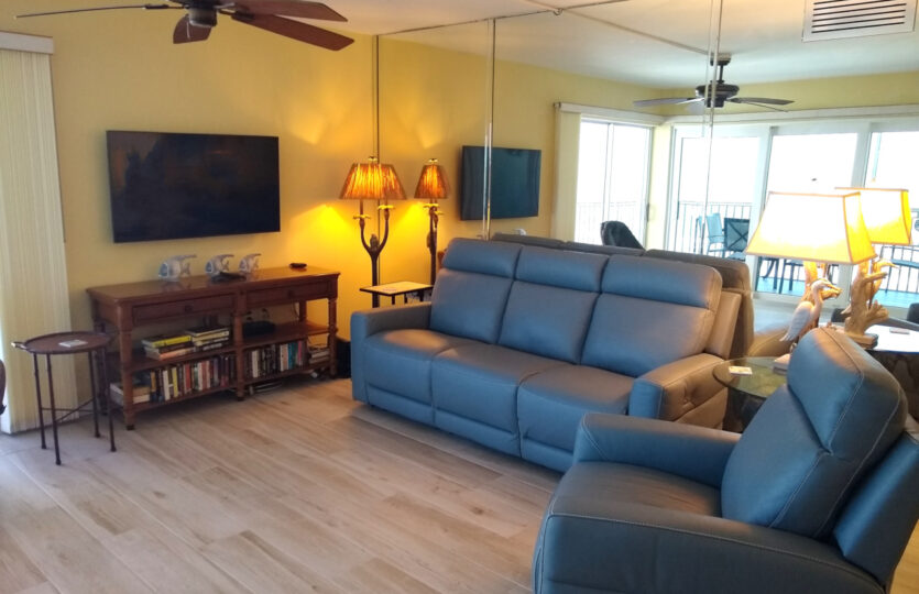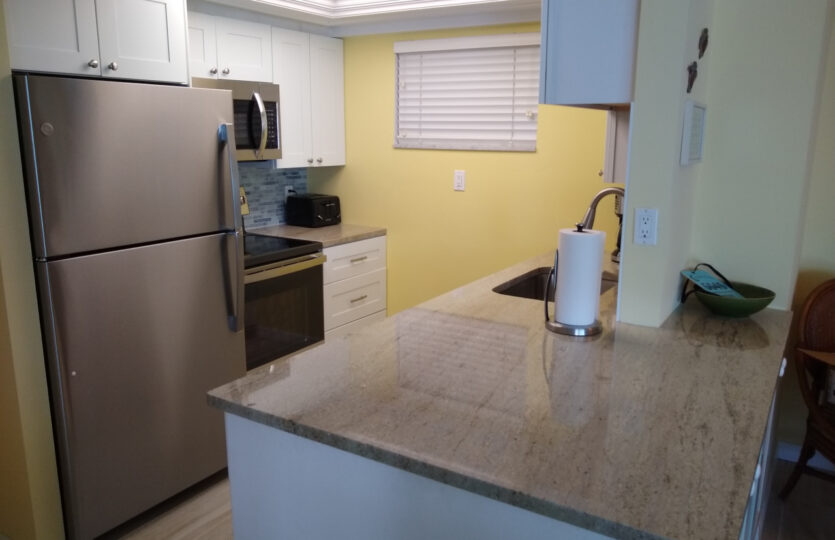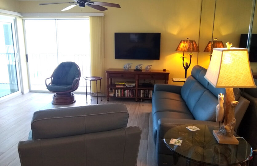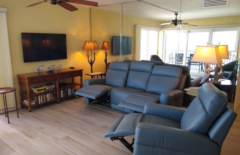This two-bedroom condo is furnished with all the necessary amenities. The master bedroom has a new pillow top king bed, the second bedroom has two new twin beds. In the living room there’s a new electric powered reclining sofa and reclining chair. The dining area has a table with 6 chairs. Included are three remote control TVs, 2 DVD’s, WiFi Internet, air-conditioning, fans in the bedrooms, all linens, and bath and beach towels. The new kitchen has all the conveniences of home, everything from corkscrew to blender. A laundry room is located just a few steps away, near the elevator. The heated pool is close by.