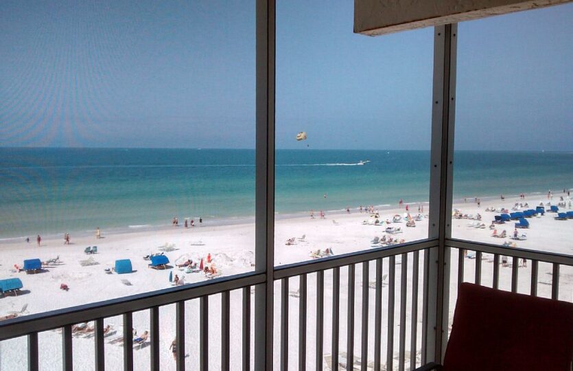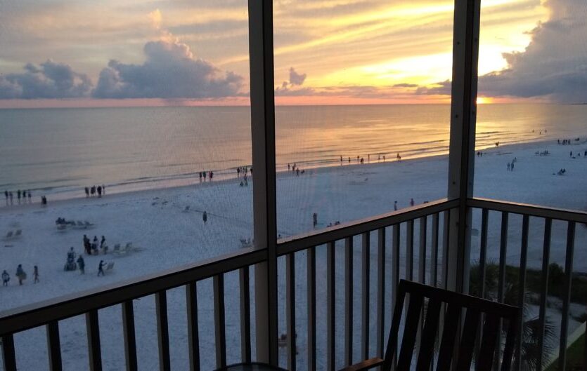 Relax in this beautiful fifth floor beach front Condo and enjoy the fantastic gulf and sunset views from the screened lanai with the beach just steps away!! It’s not unusual to be able to watch dolphins swim by in the gulf from the lanai. Crescent Beach is famous for its crescent shape with pure white sand. Made from 99% pure quartz, the sand is soft, floury and cool to the touch even in the hottest sun.