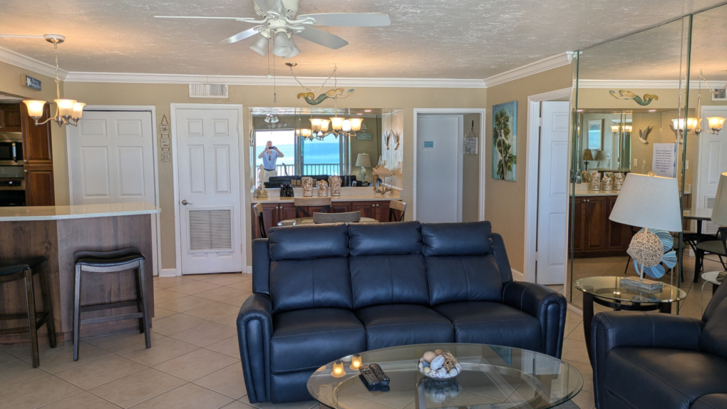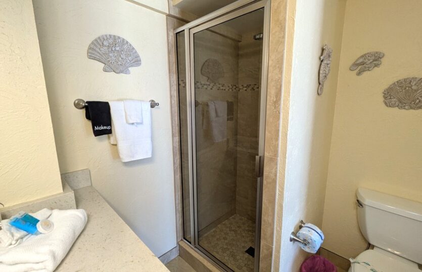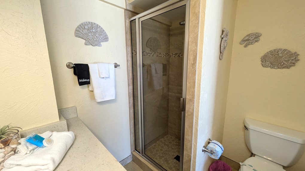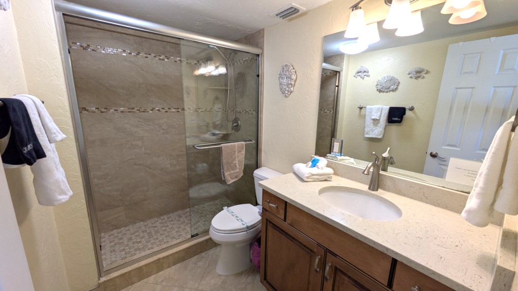 We were very pleased with our stay here: the condo was comfortable and the kitchen was exceptionally well-equipped. The view was fabulous (as shown), and we appreciated being able to use the stairs from the second-floor location. Although we didn’t use them, the condo also had a good collection of beach chairs, umbrellas, coolers, etc.