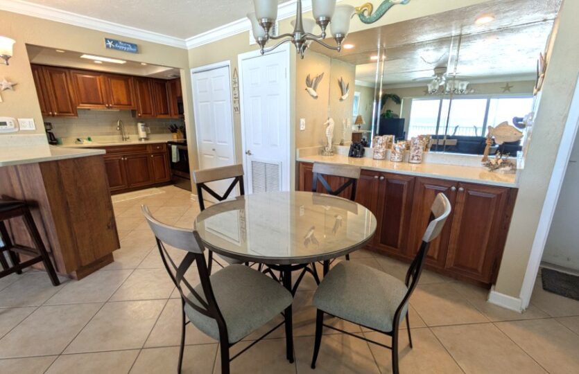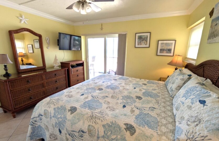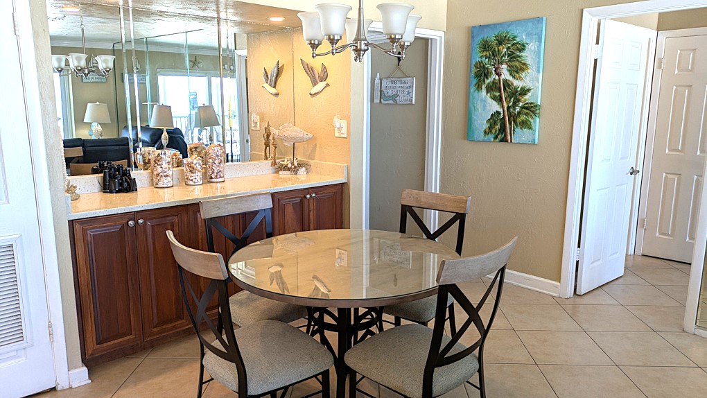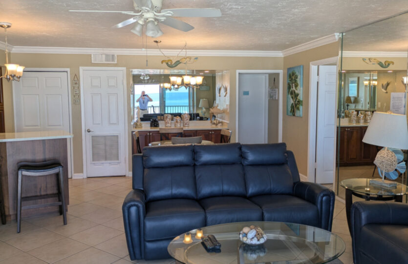 Our 2nd floor updated condo boasts a kitchen with peninsula. The kitchen has everything you’ll need to prepare meals and drinks if you choose to stay in and relax. Sleep comfortably in our bedrooms: one with a king sized bed and, private bathroom (w/shower) and the other bedroom with two full beds with private bathroom (w/shower). TVs are located in each bedroom and in the living room. The living room area has a couch and loveseat for relaxing as you enjoy the breathtaking views of the gulf or have fun entertaining.